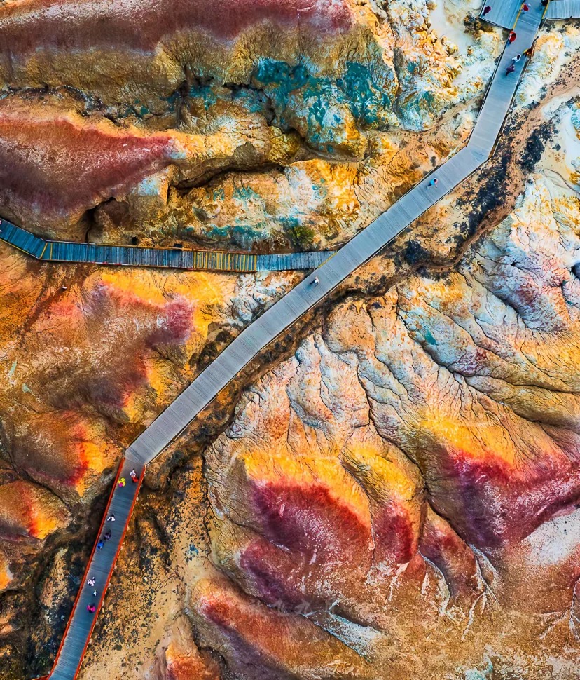 - Bãi Ngũ Sắc: được mệnh danh là “đệ nhất bãi biển trên thế giới” Con sông duy nhất ở Trung Quốc đổi ra Bắc Băng Dương với tổng chiều dài 2969 km – sông Irtysh như cốt khúc tạo nên Bãi Ngũ Sắc ở hai bờ sông, với nhiều sắc màu khác nhau trải dài từ Bắc vào Nam. Bờ nam có ốc đảo, sa mạc, bầu trời xanh ngắt, phong cảnh bảo. Bờ bắc là một địa hình giống như vách đá Yardang, với những ngọn núi nhấp nhô và thay đổi màu sắc, được hình thành bởi sự mòn mòn mạnh mẽ của dòng gió và gió. Có các mức độ khác nhau về khả năng chống phong hóa giữa các lớp đá