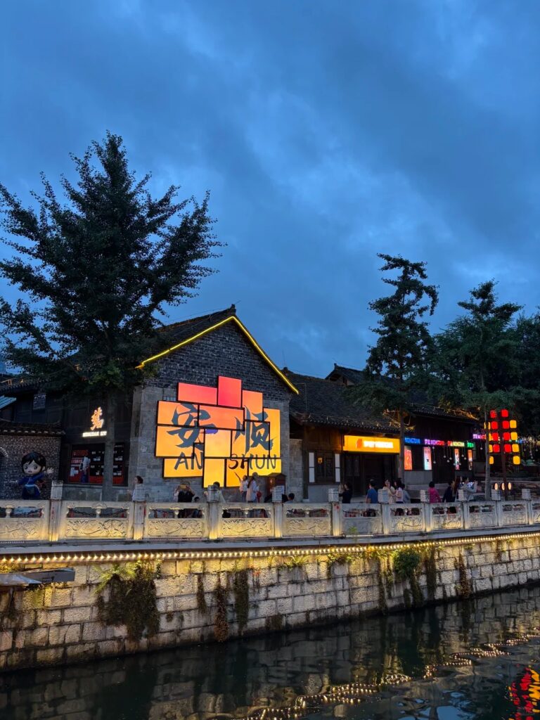 Sau bữa tối, đoàn Check-in cổ trấn An Thuận – Nằm ngay trung tâm thành phố An Thuận, đây là khu phố cổ được bảo tồn và tái hiện lại không gian văn hoá truyền thống của vùng Tây Nam Trung Quốc. Con phố có những dãy nhà mái ngói cổ, các quán trà, cửa hàng đồ thủ công và quầy ăn vặt địa phương. Trên Xiaohongshu, rất nhiều bạn trẻ giới thiệu nơi này là điểm “city walk” hấp dẫn nhất ở An Thuận vừa có thể đi dạo, ăn vặt, chụp ảnh check-in mà không cần di chuyển xa.